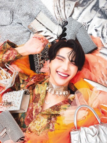 GYUTAE:うーん、どれも気に入ってはいるんですけれど、やっぱり表紙の写真も好きですし、羽をつけたシリーズも好きですね。絆創膏をつけているんですけど、これもキラキラしているものをスタイリストさんに見つけてもらって。このビジューのベストも同じブランドのもので。すごくキレイですよね。