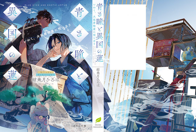 結来月:璃兵衛とレンがとにかくカッコよく描かれていて、物語の中から二人が飛び出してきたような素敵なデザインになっています。タイトルにもある「青」がとても印象的で、そのなかにもグラデーションがあるのが、この物語らしさを表現していただけているなと思い、感動しました。実際に手に取っていただいた方の反応でも、カバーに惹かれた、オビの文章で気になった、という声が多くてとても嬉しいです。それぞれの話に登場するアイテムも描いていただいて、細かなところまでこだわりのあるカバーになっています。いわくつきのアイテムたちは、素材も含めて実際に江戸時代に存在しておかしくないか、というところも気にかけて調べていったので、イラストとしてうまく表現していただけてありがたいですね。ことのは文庫さんには本当に多くのジャンルの作品があり、書店に並んだタイトルを見るだけでワクワクする、魅力的なレーベルだと思っています。