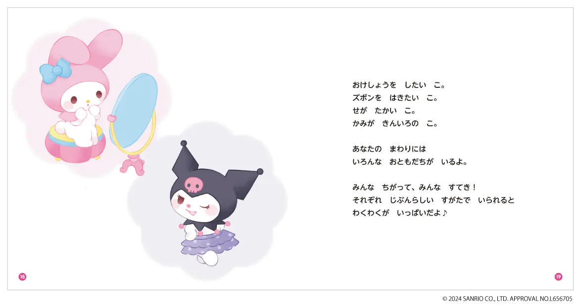 本書は、お子さんの体と尊厳を守るためのメッセージがたっぷり掲載されており。マイメロディ、クロミ、ピアノちゃん等、大好きなキャラクターと一緒に、プライベートパーツ等の体を守る意識を育める、おまもりのような一冊。