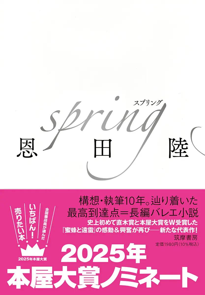 恩田陸の最新長編小説『spring』(2024年3月22日刊/筑摩書房)が、全国の書店員が最も売りたい本を選ぶ「2025年本屋大賞」にノミネートされた。恩田陸は2005年に『夜のピクニック』で第2回本屋大賞を受賞、2017年には『蜜蜂と遠雷』で2度目となる第14回本屋大賞(直木賞とのダブル受賞)を受賞しており、4月9日の発表で本作が受賞となれば、本屋大賞が始まって以来初となる“三度目の受賞”の快挙となる。