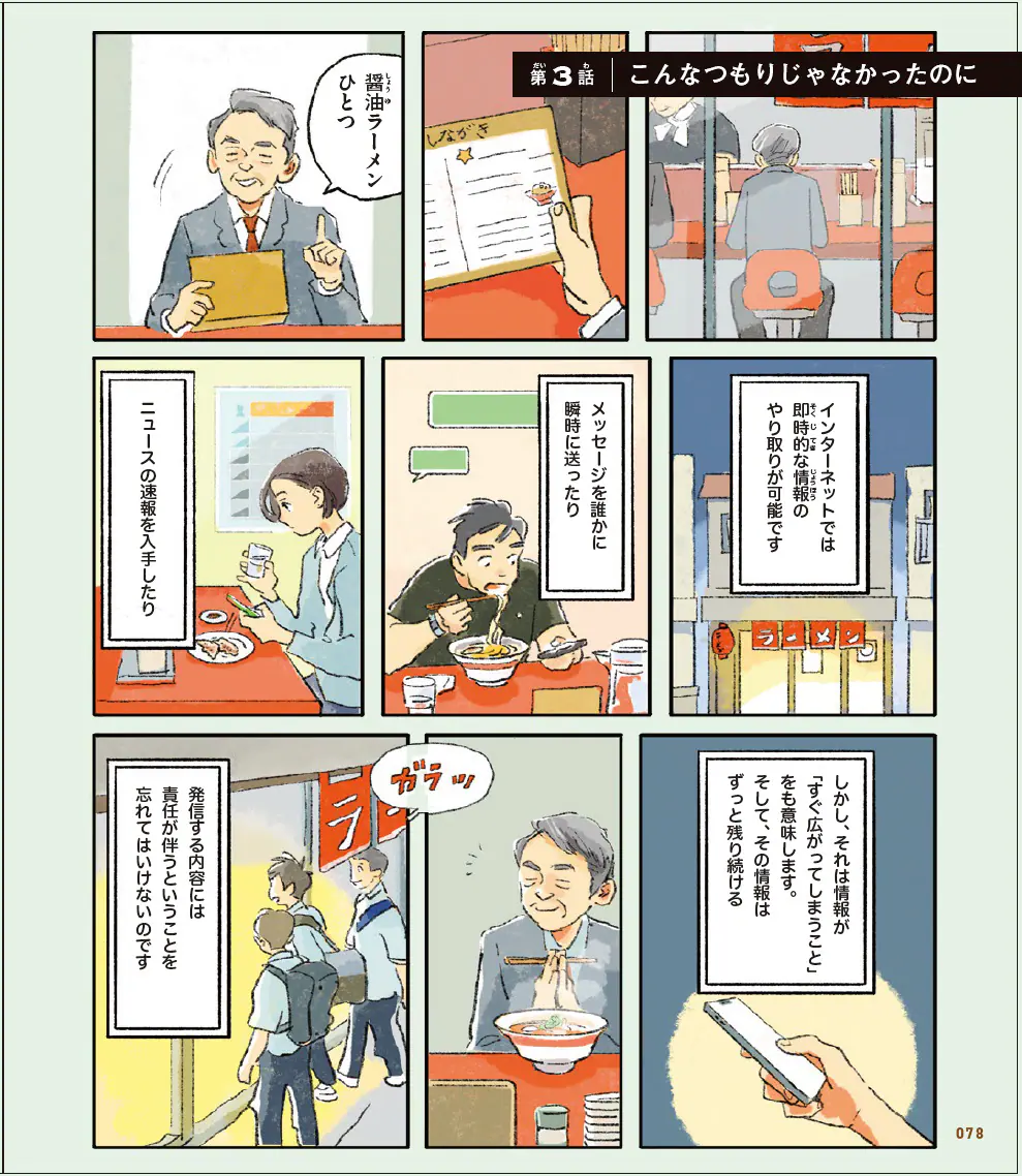 本書は全5章構成で、各章の冒頭に6ページのマンガを掲載。アイドルオーディション番組に夢中になる女子中学生、ネットの意見に左右される男子中学生、軽はずみな悪ふざけ投稿をする高校生など、リアルな事例をもとにストーリーが展開される。読者は登場人物に共感しながら、情報社会を生き抜くための知識を身につけることができる。