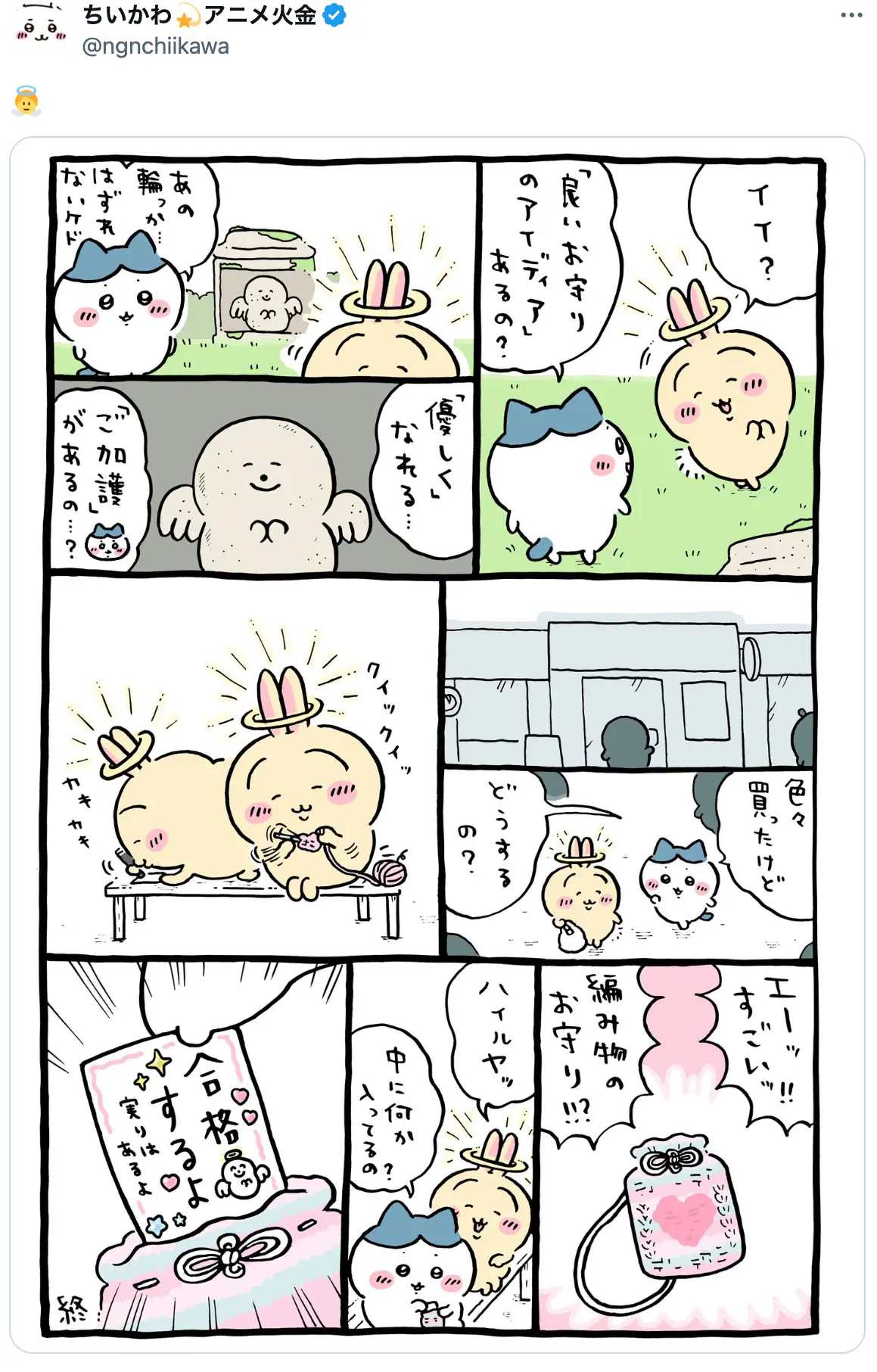 2025年も3月に入り受験シーズンが佳境を迎えるなか、ちいかわ公式Xでも人気キャラ・うさぎがお手製の合格祈願お守りをつくるエピソードが3月3日に投稿され、話題を呼んでいる。