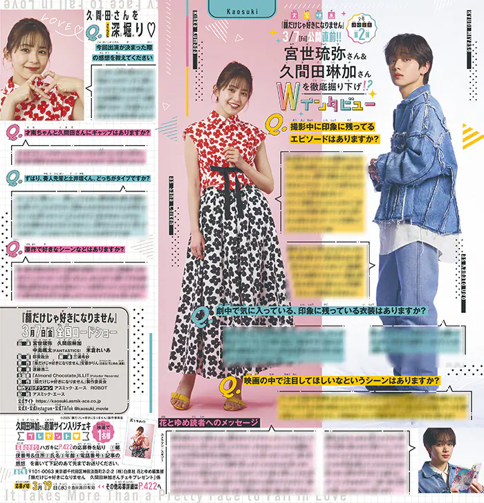 3月7日の映画公開を目前に、奏人役の宮世琉弥と才南役の久間田琳加が登場するスペシャルインタビューを掲載。映画の撮影裏話やキャストの思いを語る。また、映画の撮影風景を描いた特別レポまんがも収録される。
