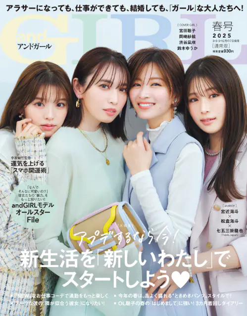 3月7日にDONUTSより発売された女性向けファッション誌『andGIRL』。今号の表紙は、【通常版】を宮田聡子・岡崎紗絵・渋谷凪咲・鈴木ゆうか、【特別版】をTravis Japanの宮近海斗・松倉海斗・七五三掛龍也が務めた。