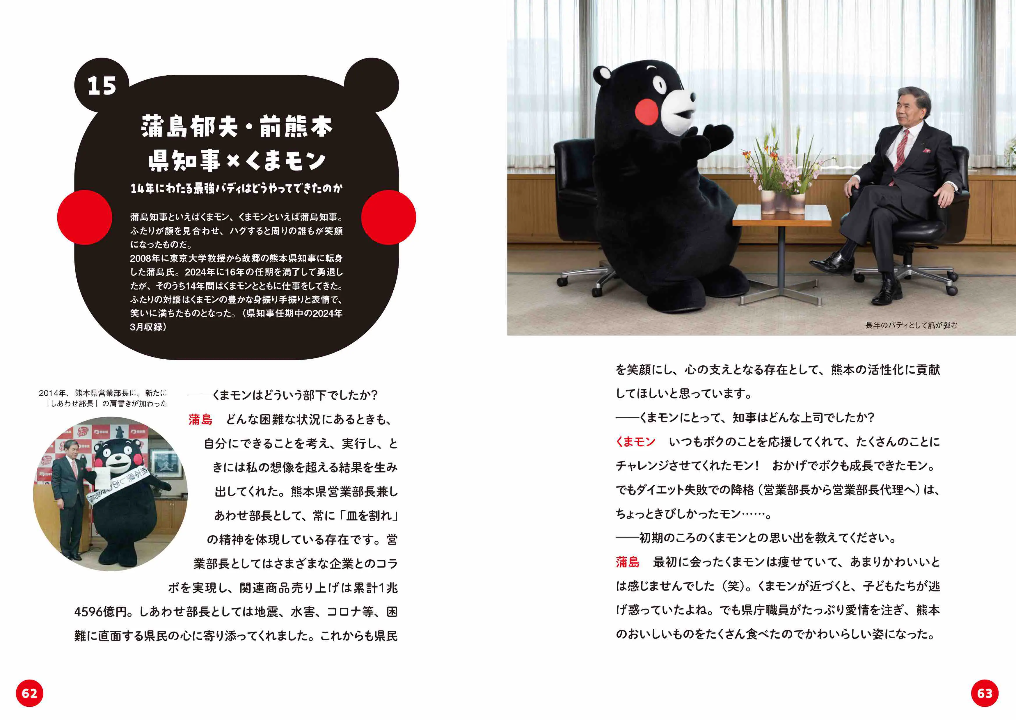 第1章では、大阪修業時代や「ゆるキャラ®グランプリ」優勝時の心境、熊本地震の経験、そして「みんなサンくま」プロジェクトなど、くまモン自身の言葉で綴られるエピソードを収録。蒲島郁夫・前熊本県知事とくまモンの対談も掲載。