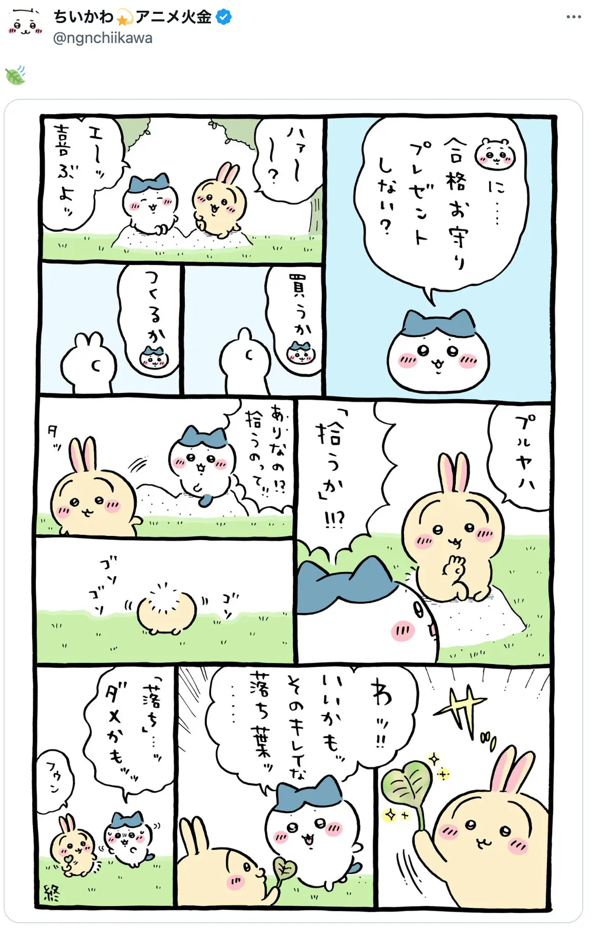 今回のお話でスポットライトを浴びたのはうさぎ。草むしり検定5級の合格を目指し勉強に励むちいかわに、合格お守りをプレゼントしようとするハチワレとうさぎ。お守りになるものを探すなか、うさぎが拾ってきたのは天使の輪ような「なにか」だった。