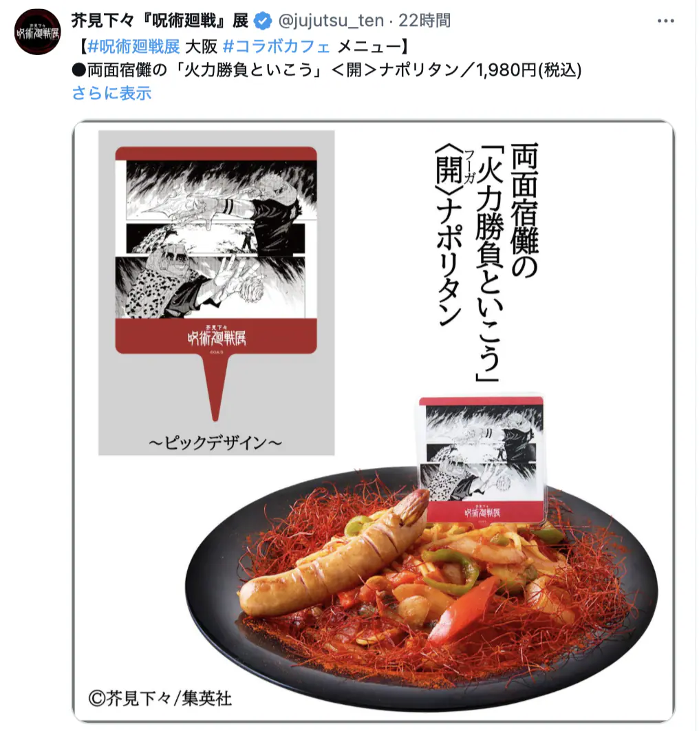 ●両面宿儺の「火力勝負といこう」<開>ナポリタン/1,980円(税込)… pic.twitter.com/iP8MI4A29e— 芥見下々『呪術廻戦』展 (@jujutsu_ten) 2025年3月26日