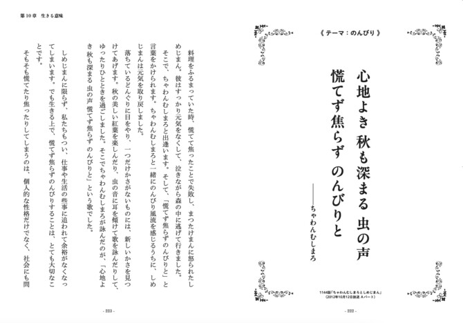 例えば、第10章の「生きる意味」のパートで紹介しているしめじまんのエピソードは、自己肯定感が下がってしまっている現代人にぴったりの話だなと思いました。料理をふるまう際に、焦って失敗してしまったしめじまんは、まつたけまんに叱られたことで、すっかり元気をなくしてしまい、森の中へ逃げ込んでしまいます。でも、そこに現れたちゃわんむしまろというキャラクターと一緒に、秋の紅葉を楽しんだり、虫の音に耳を傾けて歌を詠んだりするうちに、ゆったりとしたひとときを過ごすことができ、元気を取り戻します。彼の詠んだ「心地よき 秋も深まる 虫の声 慌てず焦らず のんびりと」という歌が印象的です。