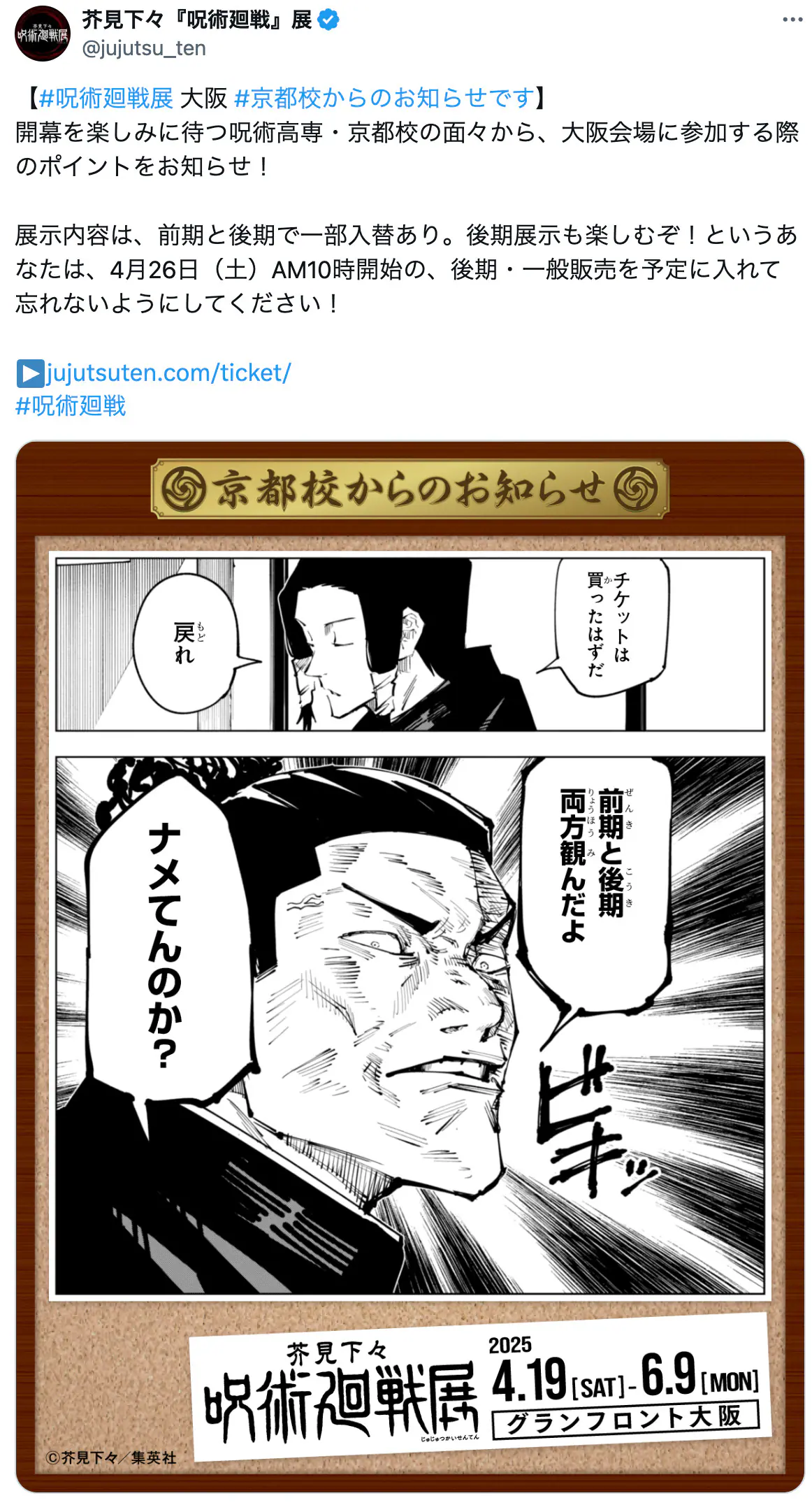 開幕を楽しみに待つ呪術高専・京都校の面々から、大阪会場に参加する際のポイントをお知らせ!… pic.twitter.com/3upTjFDp8L— 芥見下々『呪術廻戦』展 (@jujutsu_ten) March 29, 2025