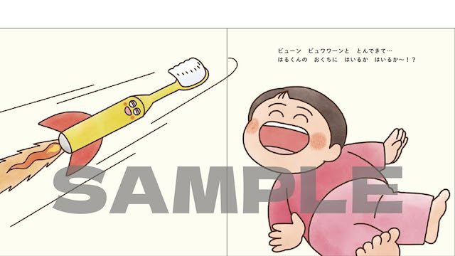 木下:よりたくさんの方の手元に届き、そして残るということを考えると、今まで意識していなかった部分にまで気を配らなければならないなと感じました。たとえば、『はぶらしロケット』では、前半にほっぺなどに不時着する展開があるんですが、我が家でやるときなんかは、歯ブラシの柄の部分を口の中に入れようとして、子どもから「逆〜!」ってツッコまれて笑いが生まれることもあるんですよね。ほかにも、僕の頭に不時着させて「お父ちゃんの頭イテテテ〜」なんてボケてみたり、「飛んでっちゃった〜」と遠くに飛ばしちゃったり。そんなふうに子どもが喜ぶならいくらでもパターンを変えて繰り返すんですけど、絵本で何度も不時着の場面を見せるのも「テンポが悪くなりそうだな」とか「これ、衛生面的にどう?」となりまして……そのラインを見極めるのが難しいなと思いました。なので絵本では、まず誰もが真似できる基本の形を目指すことに。その先のアレンジは、それぞれのご家庭で楽しんでいただけたらと思います。