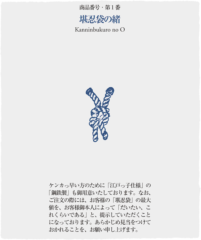 商品番号1番の「堪忍袋の緒」を見てみよう。一見なんの変哲もない、硬く結ばれた紐というビジュアルだが、下町の職人が手作りしているというエピソードとともに鑑賞するとリアリティがある。