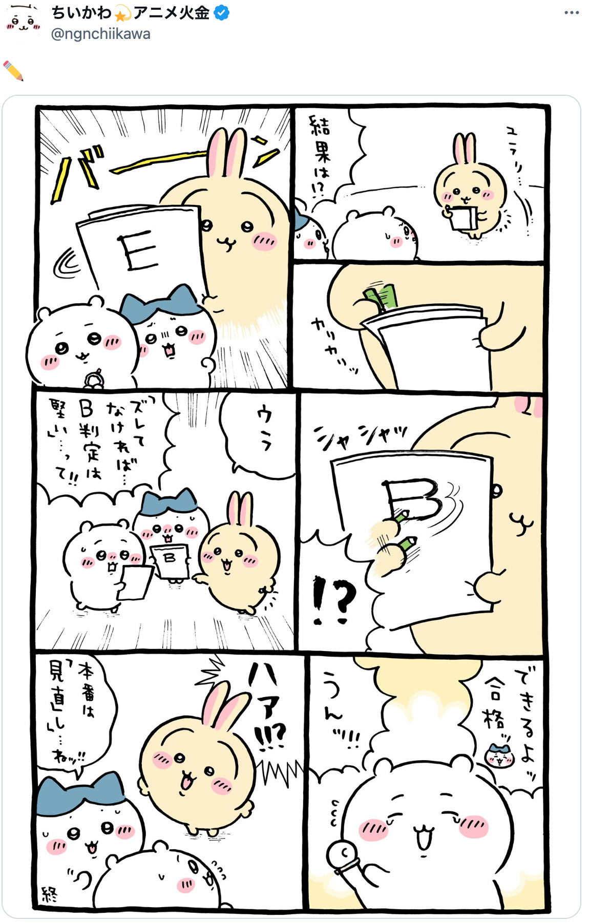 後ろめたさを感じ落ち込むハチワレに、ちいかわは合格祝いのクッキーをプレゼント。悔さなどおくびにも出さず自分の合格を喜んでくれる、ちいかわの大きなやさしさにハチワレは涙ぐむ。その後、一足先に合格したハチワレがちいかわの試験勉強を手伝う様子が見られている。