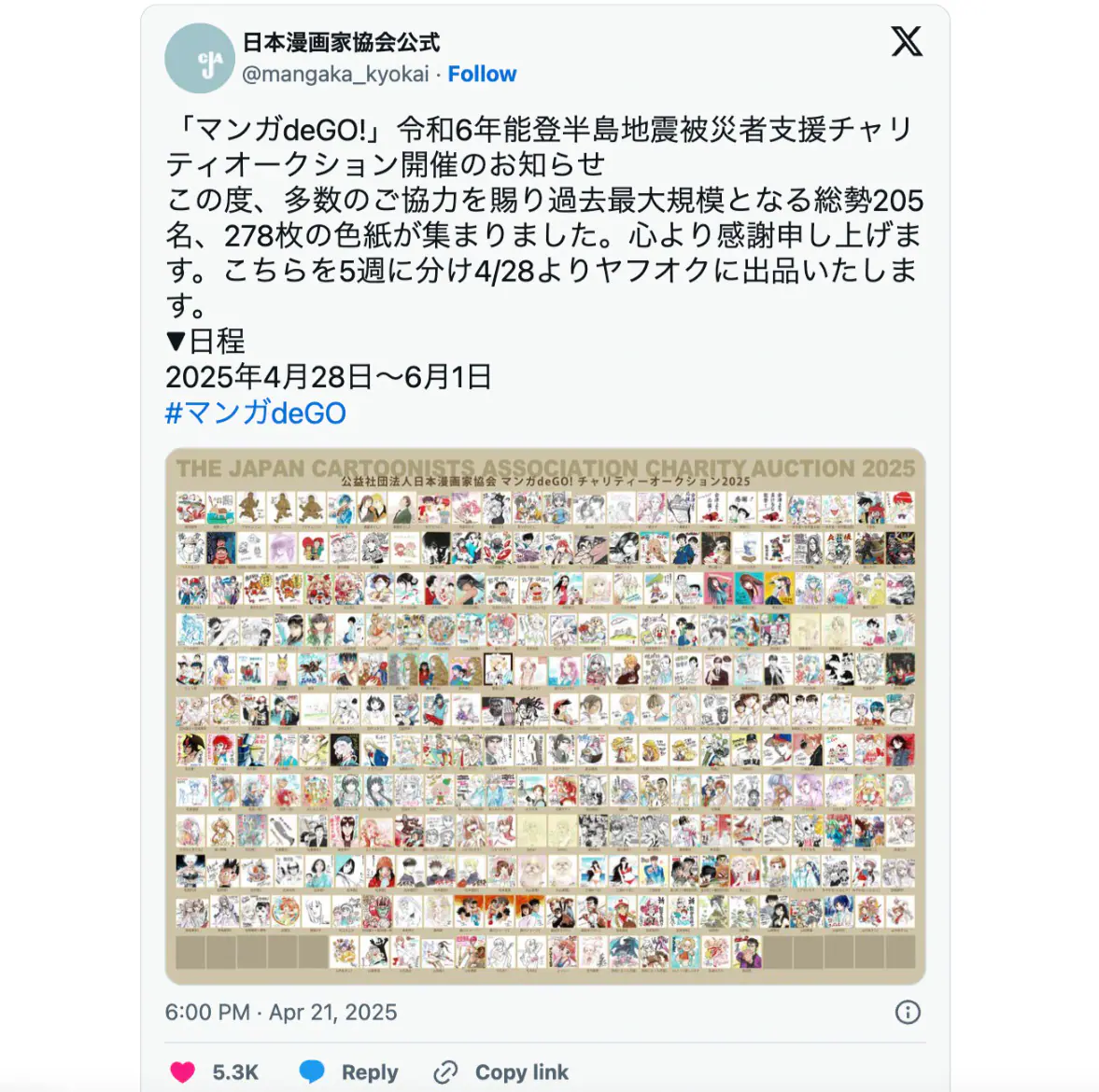 2025年4月28日〜6月1日#マンガdeGO pic.twitter.com/gfLCRaZIdN— 日本漫画家協会公式 (@mangaka_kyokai) April 21, 2025