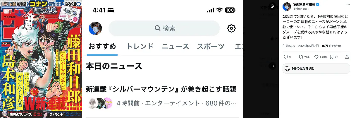 サンデー23号の発売日、島本氏はXで「朝起きてX開いたら、1番最初に藤田和ヒーローの新連載のニュースがボーンと単独で出ていて、そこからまず再起不能のダメージを受ける爽やかな朝‼︎おはようございます‼︎」と恨み節。藤田氏は「こんなんで、も、もう再起不能なのかよ!?( ̄Д ̄:)ノ 見なきゃイイでしょ!」と返答し、以降、お互いの作品をツンデレ的に褒め合いながら、赤裸々な思い出話も交えてレスバトルが続いている。