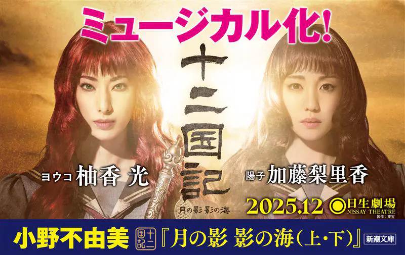 小野不由美氏によるファンタジー長編「十二国記」。そのエピソード1である『月の影 影の海』が2025年、ミュージカル化される。原作である新潮文庫『月の影 影の海 十二国記』(上下)に、ミュージカルでふたりの“中嶋陽子”役を演じる柚香光さんと加藤梨里香さんのビジュアルが入った帯が制作された。メインビジュアルの解禁以降、全国の書店で好評発売中だ。