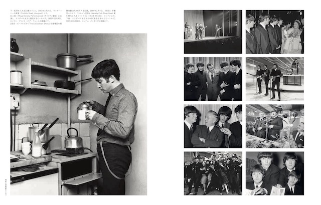 「マザー」に続くページは、父に去られ、母を事故で奪われたジョンの幼少時の回想。痛々しい話を、四人の伯母やいとこたちと一緒に映った、やんちゃそうな子供時代の写真が癒やしてくれる。対照的に、「思い出すんだ(リメンバー)」の後は、上流家庭の令嬢として、開戦前の日米を行き来して育ったヨーコの回想。四八枚の幸せそうなスナップショットが並んだ次に、焼け野原となった東京のショッキングな航空写真をもってくる配列の妙も本書の美学の一部だ。「労働者階級の英雄(ワーキング・クラス・ヒーロー)」のところには、ポールの実家の、見た目に汚い台所で紅茶をいれる二二歳のジョンの写真が胸に響く。