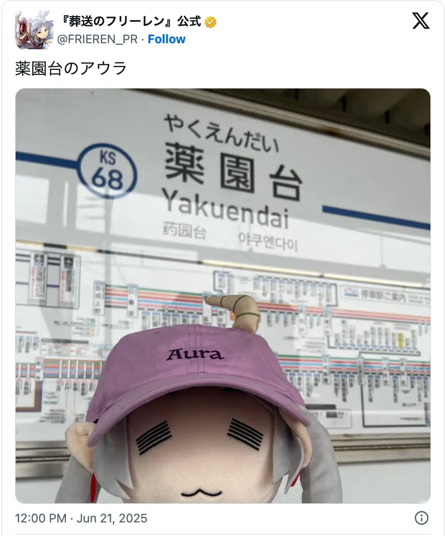 そしてこの6月に投稿数を増やしているのが、フリーレンに無慈悲に討伐された人気キャラクター「断頭台のアウラ」をもじったポストだ。浅草線「高輪台」駅から横浜市営地下鉄ブルーライン「湘南台」駅、京成電鉄松戸線「薬園台」駅など、「⚪︎⚪︎台」と名のつく首都圏の駅にアウラのキャップを被ったフリーレンのぬいぐるみが出没し、いわば“ご当地アウラ”的な投稿を続けているのだ。