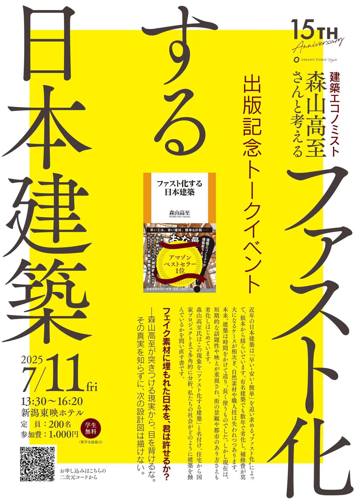 2025年4月24日に発売され、Amazonでベストセラー1位となった『ファスト化する日本建築』の著者、建築エコノミスト・森山高至のトークイベントが新潟東映ホテルで7月11日に開催される。主催はオーガニックスタジオ新潟がつとめる。