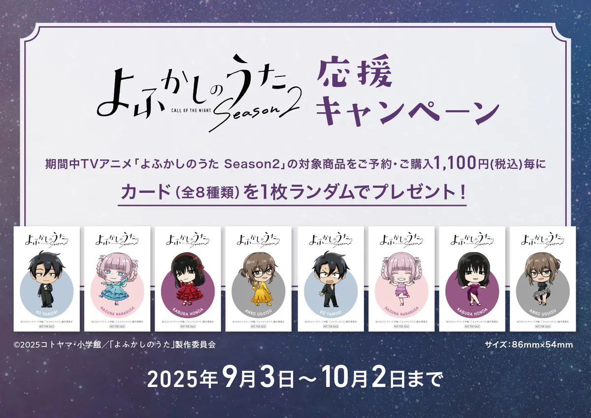 また、展開が可能な販売店にて、TVアニメ「よふかしのうた Season2」応援キャンペーンを実施。対象商品を予約、購入1,100円(税込)毎に、86mm×54mmサイズカード(全8種類)が1枚ランダムでプレゼントされる。