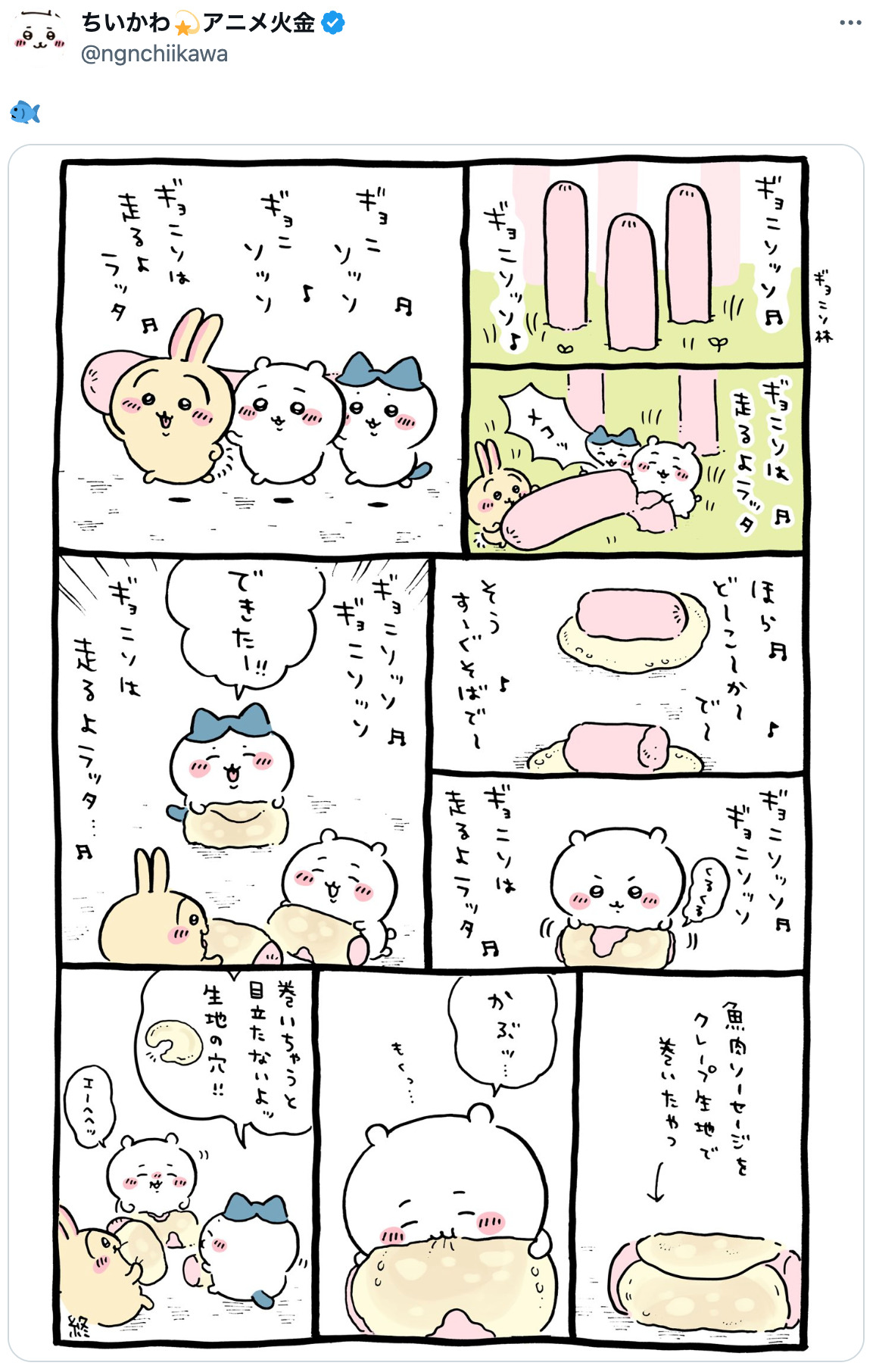 今回のエピソードではちいかわ・ハチワレ・うさぎがクレープ作りに挑戦する微笑ましい様子が描かれた。そのなかでも注目を集めたのは劇中で流れた「ギョニソのうた」だ。
