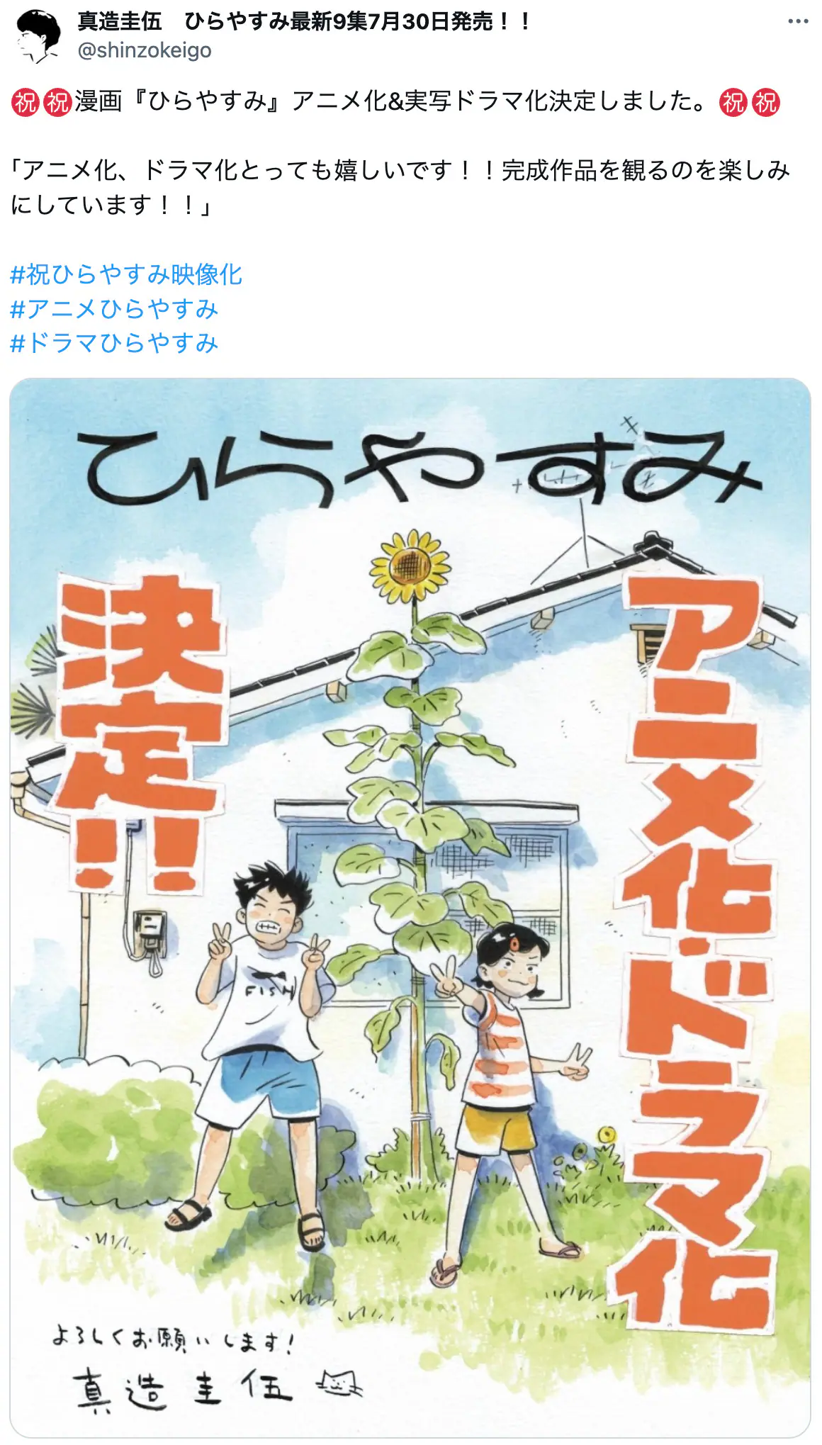 2025.07.22 19:14 『ひらやすみ』真造圭伍の”夏い"映像化お祝いイラスト 妻の谷口菜津子と揃ってドラマ化 文=加藤かづき 漫画真造圭伍週刊ビッグコミックスピリッツひらやすみ加藤かづき Facebookでシェア xでポスト はてなブックマーク LINEで送る 真造圭伍による漫画『ひらやすみ』のアニメ化・実写ドラマ化が7月22日に発表され、ファンを中心に大きな反響を呼んでいる。 本作の主人公・生田ヒロトは役者を目指し山形から上京したものの、役者の夢は諦め… 続きを読む