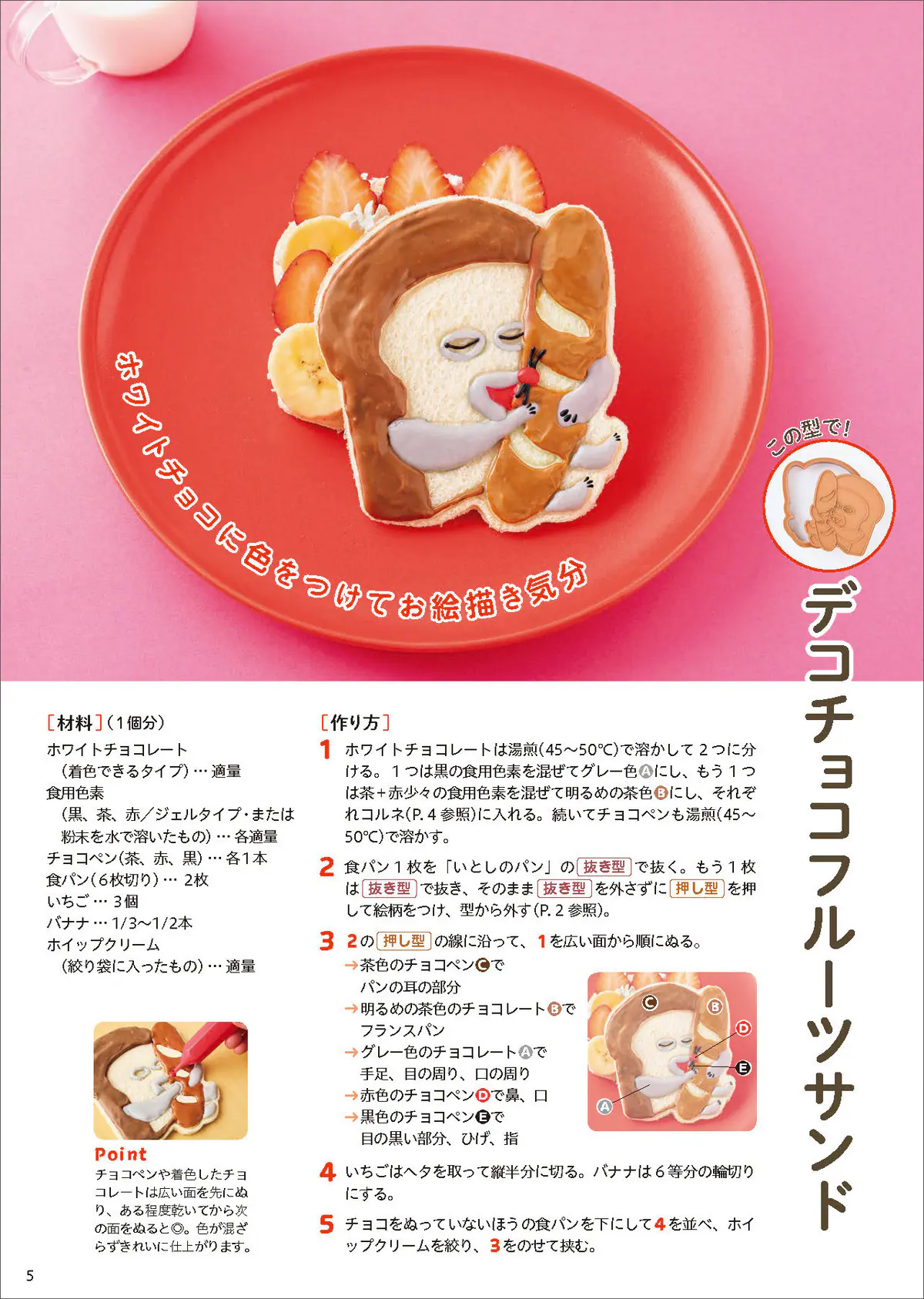 「パンどろぼう」「しょくパン」「フランスパン」の抜き型&押し型セットを使い、かわいいパンどろぼうのクッキーやどら焼き、ケーキなどのおやつから、カレー、ちらしずし、オムライスなどをつくることができる1冊だ。