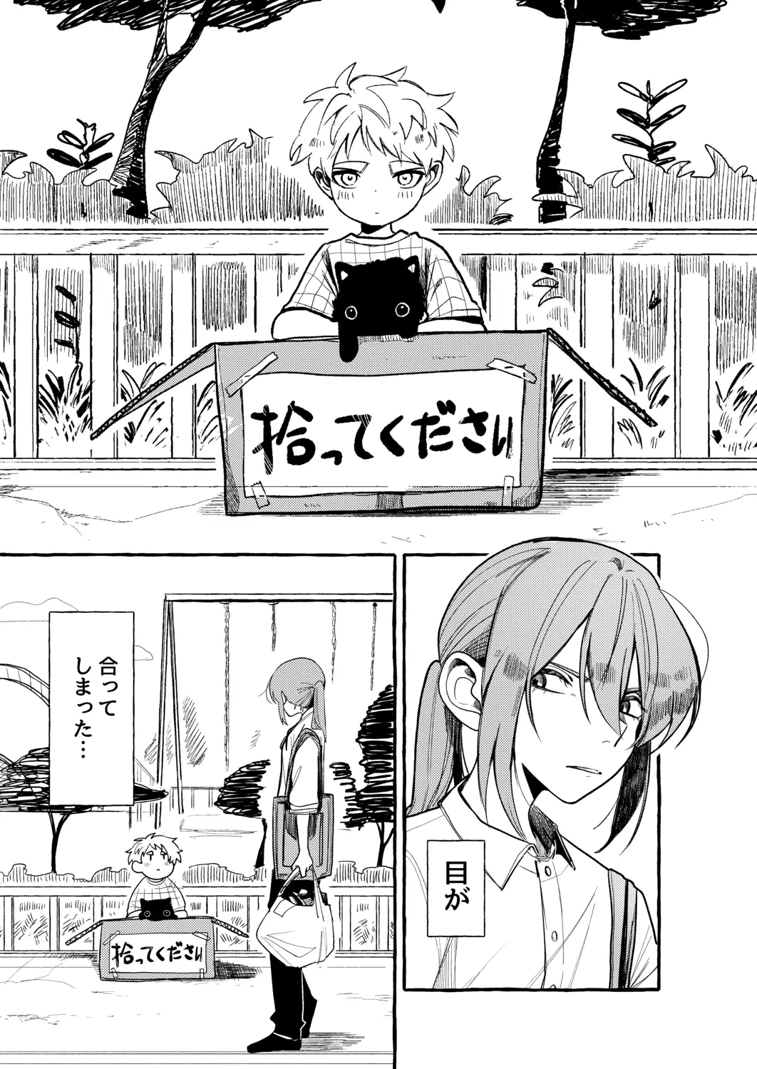 「拾ってください」と書かれた紙が貼ってある段ボールに入った、1人の少年と1匹の猫。目が合ってしまった女性はとりあえず猫を引きとるも、猫を見ると“辛い過去”が頭をよぎり……。