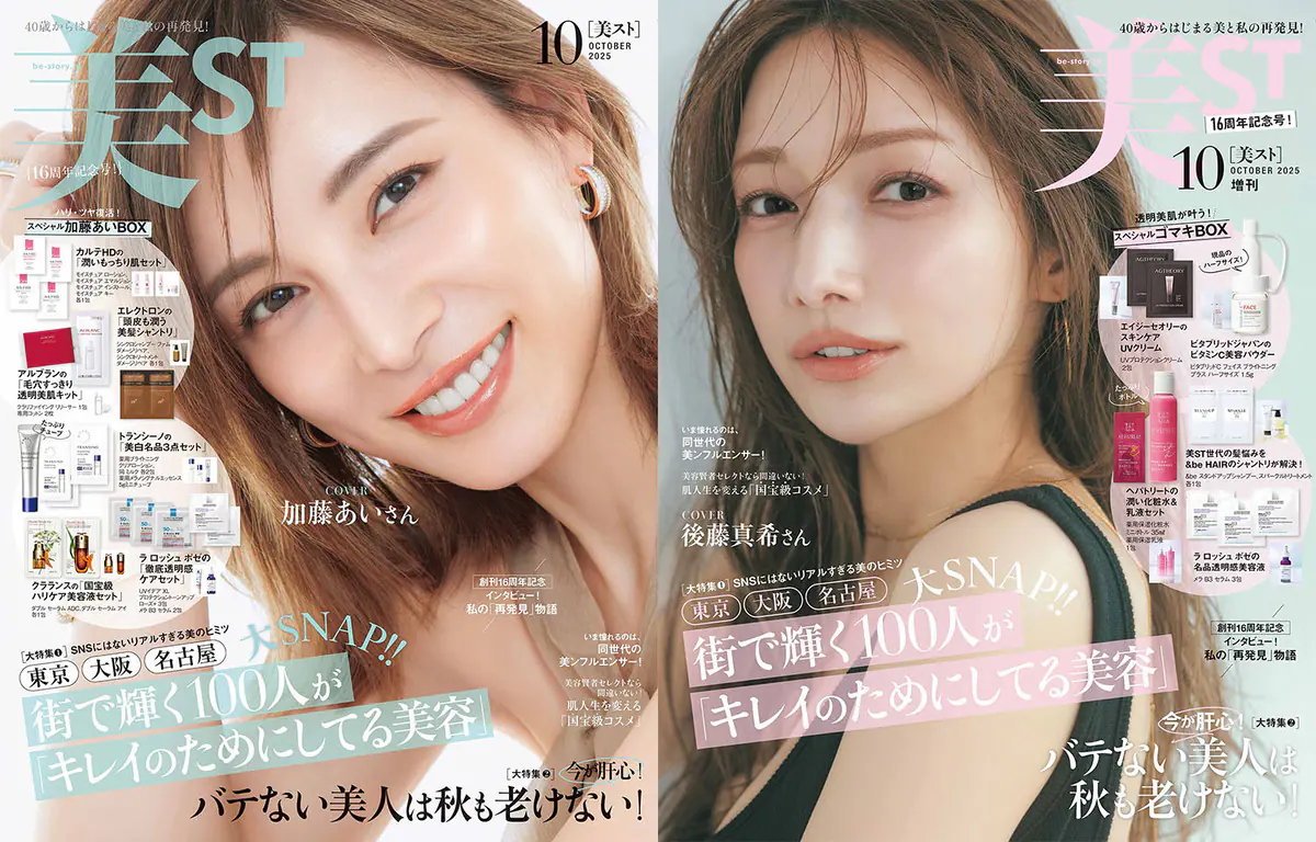 10月号で創刊16周年を迎える『美ST』は本誌・増刊の2パターンで発売される。本誌の表紙は加藤あいが務め、「加藤が40歳を超えて気づいた『気持ちいい心のアンテナのはり方』」がテーマだ。加藤あいが内面外見ともに美しさをキープするために実践しているポジティブマインドを語る。本誌付録は「ハリ・ツヤ復活!スペシャル加藤あいBOX」。