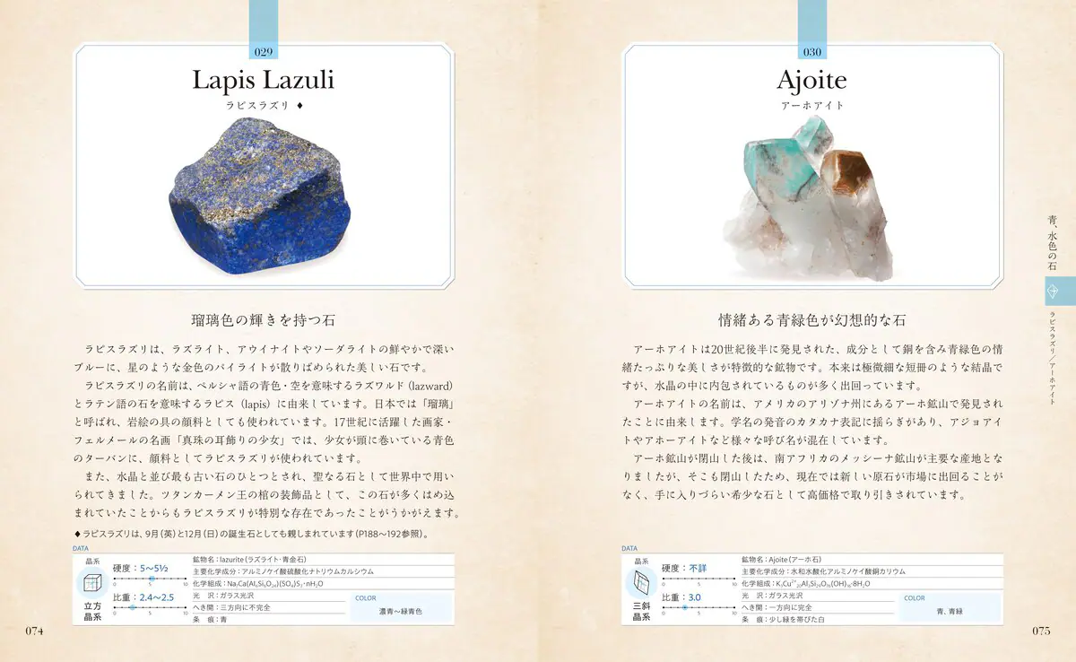 石ごとに結晶系、比重、硬度、光沢、劈開(へきかい)、条痕などの詳細データも掲載。巻末ではデータにまつわる基礎知識も解説される。