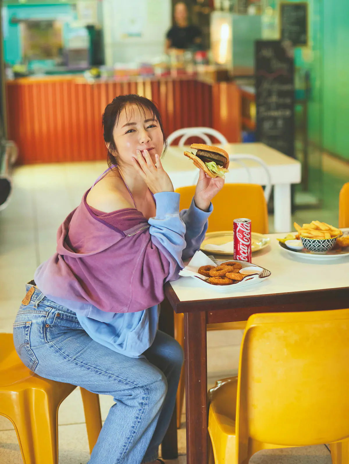このたびの「FRIDAY」では先行カットが掲載。中でもとっておきのカットが、ケアンズ市街にあるカジュアルなモーテルで窓越しに撮影された1枚だという。ベッドに横たわった磯山さやかをおさめたカットに加え、ケアンズ郊外のダイナーでハンバーガーに笑顔で頬張るカットも公開されている。