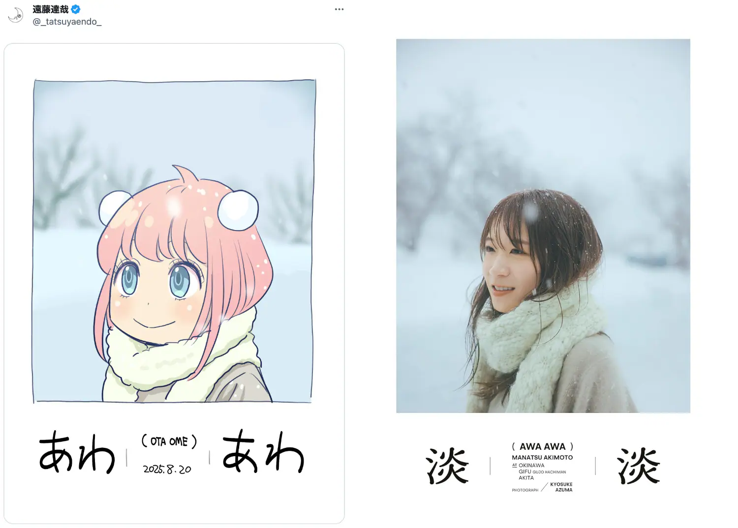 遠藤は、自身のX(@_tatsuyaendo_)で8月20日に雪景色の中白いマフラーを巻いたアーニャのイラストをポスト。同日に発売された、元・乃木坂46メンバーである秋元真夏のフォトブック『淡淡(あわあわ)』のカバー写真をオマージュしたイラストだ。8月20日は秋元の誕生日でもあったため、書籍では「AWA AWA」と記載されているところが「OTA OME」となっている。