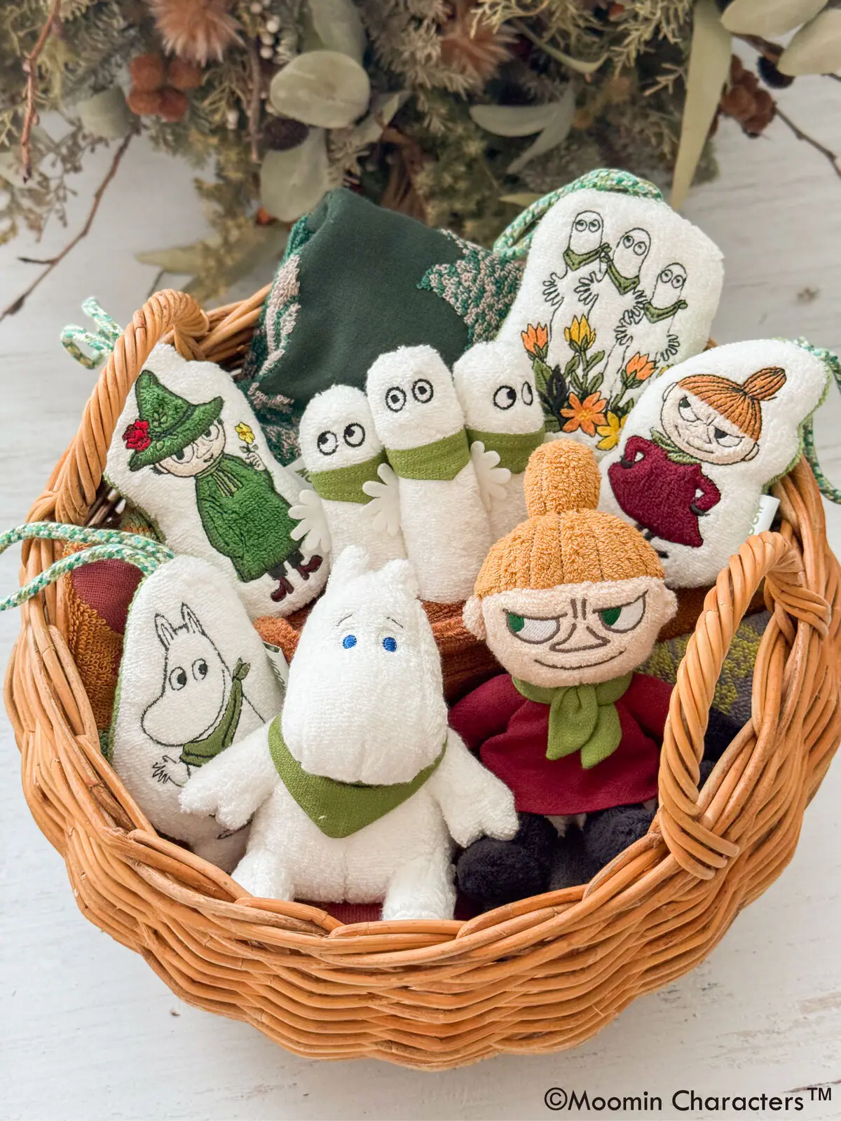 おすわりポーズとムーミンたちの個性あふれる表情、コンパクトなサイズ感が魅力。お揃いの緑色のスカーフがポイント。