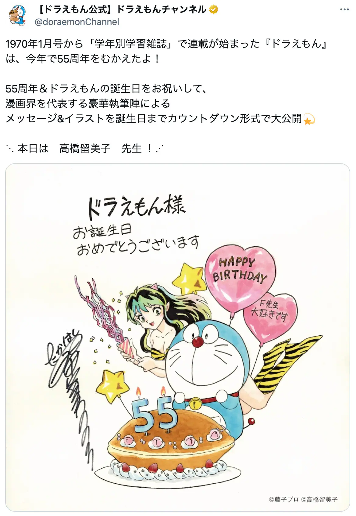 9月3日のドラえもんの誕生日まで漫画界を代表する豪華執筆陣によるメッセージ&イラストがカウントダウン形式で公開されている本企画。高橋留美子のお祝いイラストは、ドラえもんとラムちゃんのほか、数字の55が型取られたろうそくが立てられた大きなどら焼きに「F先生 大好きです」と書かれた風船などに彩られている。柔らかな色合いと、どこか初期のドラえもんを思わせるタッチにほっこりさせられるイラストには「ドラえもん様 お誕生日 おめでとうございます」と高橋の手書きメッセージとサインも共に記されており、国民的作品同士の豪華なコラボとなった。