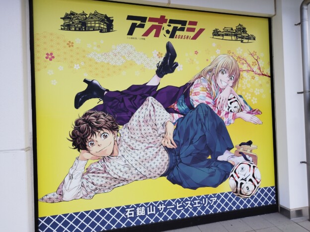 車で県外から愛媛までの旅行を考えている方には、石鎚山サービスエリア(上り)を休憩場所として選んでもらいたい。夏目漱石の小説「坊っちゃん」の登場人物、坊っちゃんとマドンナの格好をした葦人と花に出会うことができる。ふとしたところでばったり『アオアシ』に遭遇できるのも愛媛県ならではの魅力だろう。