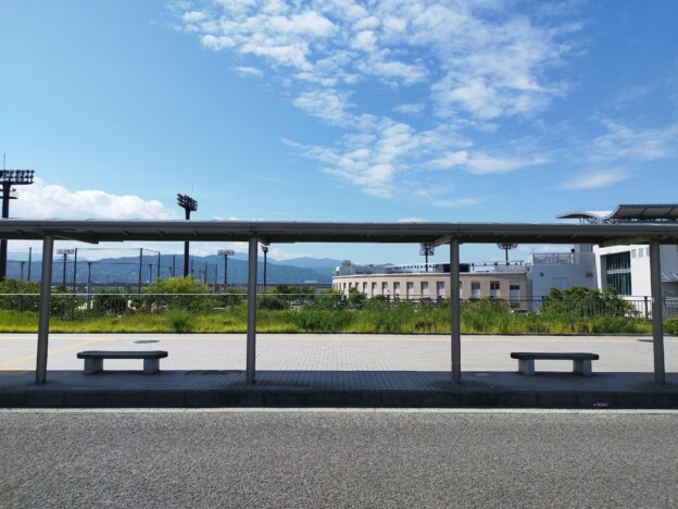 例えば、エスペリオンタウンバス乗り場の元となった場所も松山中央公園にある。『アオアシ』読者なら訪れた瞬間に作中の光景と瞬時にリンクするくらいにはお馴染みの風景だ。青く抜ける空が心地よい空間だ。景色とセットで楽しみたいところだ。