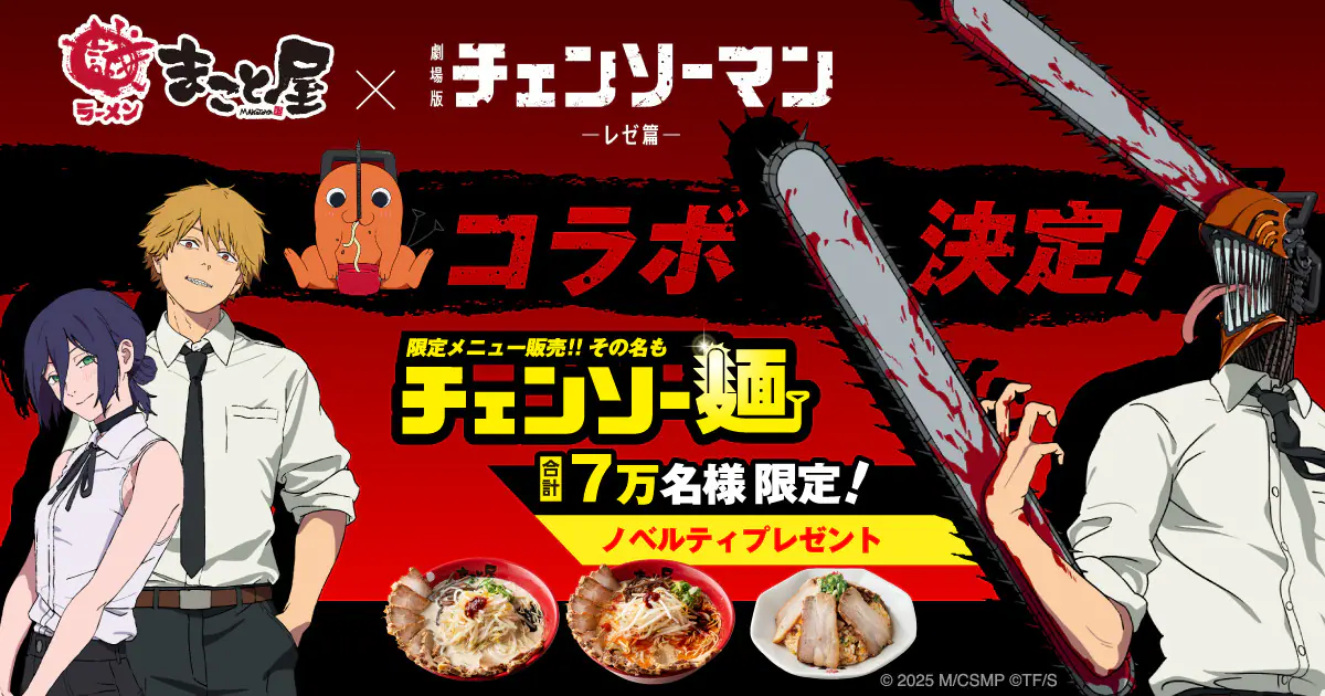 劇場版『チェンソーマン レゼ篇』と「牛骨ラーメンまこと屋」がコラボしたラーメン「チェンソー麺!」が9月19日(金)AM11:00〜11月24日(月)まで全国の各店舗で展開される。