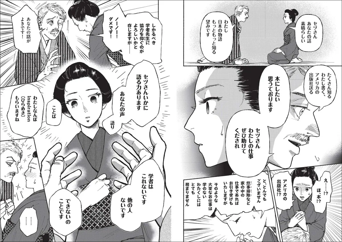 2025年後期の連続テレビ小説『ばけばけ』のモデルとして注目を浴びている小泉八雲と妻・セツ。その二人の出会いや生活、創作の過程をマンガで描き出した一冊だ。