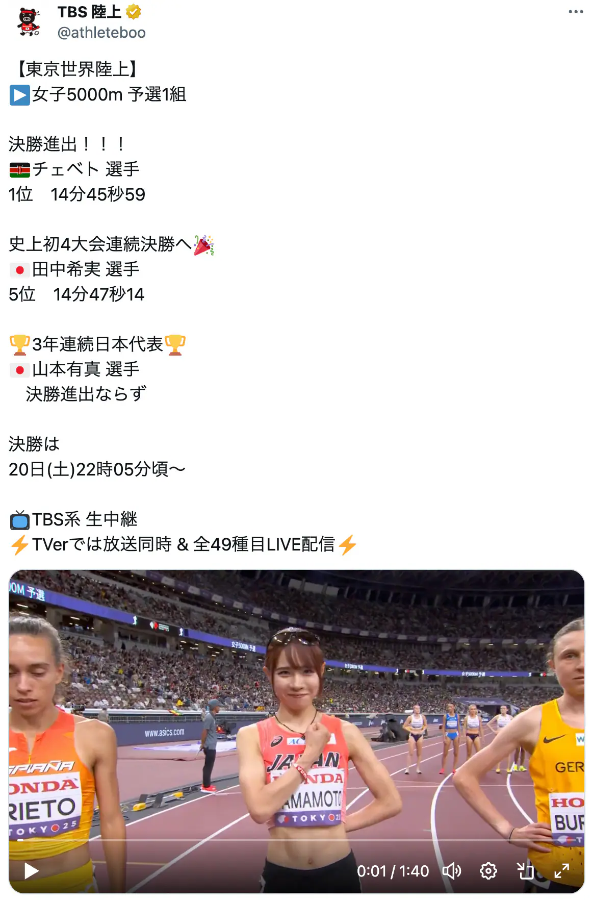 ⚡️TVerでは放送同時 & 全49種目LIVE配信⚡ pic.twitter.com/HoCFzRXsf8— TBS 陸上 (@athleteboo) September 18, 2025