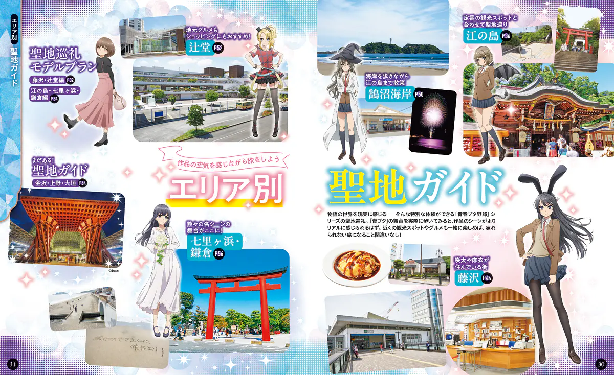 「聖地巡礼モデルプラン」「エリア別スポット情報(江の島/藤沢/鵠沼海岸/辻堂/七里ヶ浜・鎌倉)」「まだある聖地(金沢/大垣/上野)」といったエリア別聖地ガイド。「双葉理央による物理用語解説」「峰ヶ原高校誌上オープンスクール」「青ブタ深掘りラボ(桜島麻衣/スイートバレット/不可思議のカルテ/博多弁/青ブタ年表)」といった深堀り特集などが掲載される。