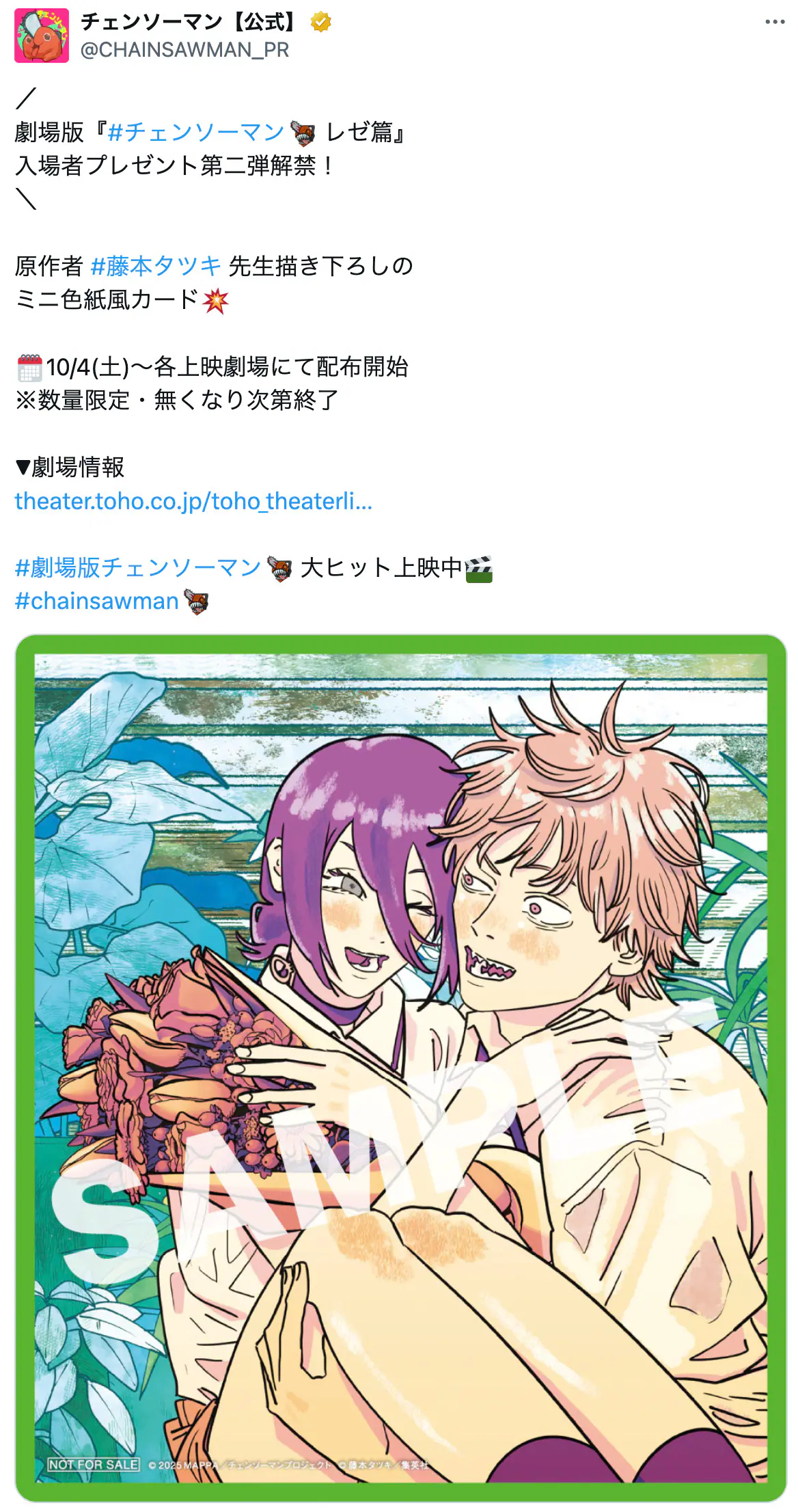 ◥◥◥◥#劇場版チェンソーマン 大ヒット公開中🎬#チェンソーマン #chainsawman pic.twitter.com/E6cajUTgli— チェンソーマン【公式】 (@CHAINSAWMAN_PR) September 20, 2025
