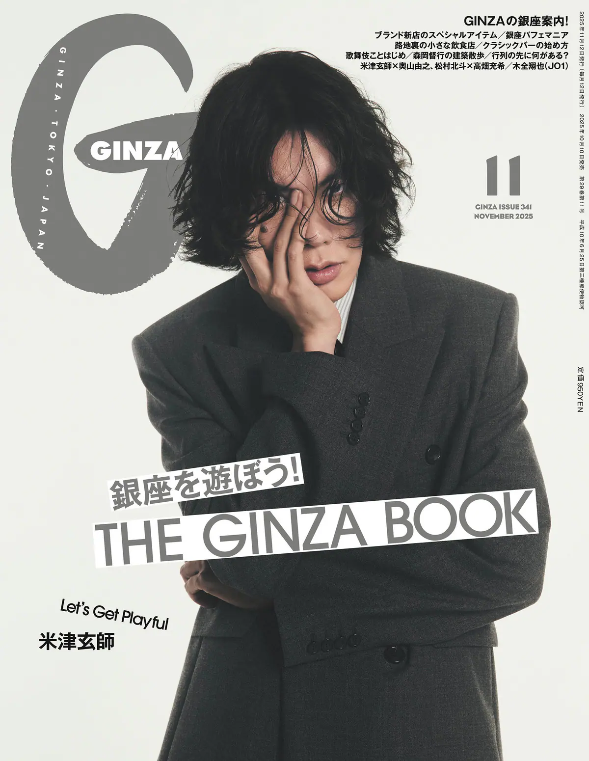 『GINZA』11月号の特集は「銀座を遊ぼう!THE GINZA BOOK」。目まぐるしく変わるあこがれの街、銀座を、GINZAが8年ぶりに大特集した。ファッション、フード、カルチャーなど銀座三丁目の編集部から歩いて探した銀座の今が掲載されている。表紙には、ダブルのテーラードジャケットに身を包み、カメラを見つめる米津玄師が登場。中面のファッションストーリーでも、ツイードやチェック、テーラリングが効いた英国スタイルを着こなしている。撮影時にはライヴやMVで見せる軽やかな身のこなしを想起する、変幻自在のポージングをカメラ前で披露。クールでクラシックなスタイリングと相反する、米津の新鮮な表情がにじむ秋のプレイフルなショットが詰まっている。