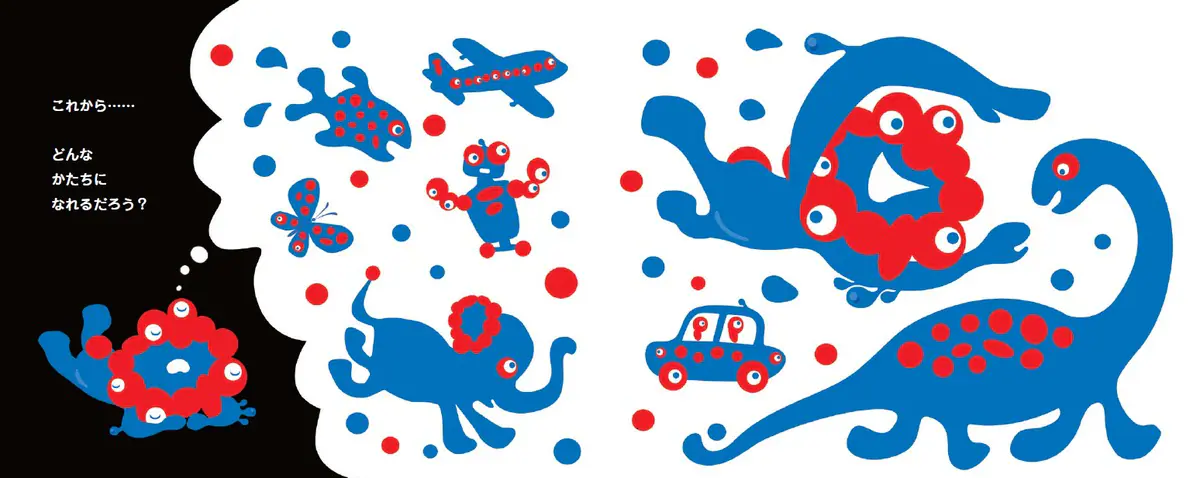 『ミャクミャクと… ミャクミャク誕生ものがたり』の作・絵はミャクミャクをデザインした絵本作家・デザイナーの山下浩平が担当。小さな細胞として誕生したミャクミャクが、ほかの生き物や自然、文明と出会うことで、世界に存在する形や色の中にある素晴らしさを見つけ、想像、変化、共生しながら未来へ脈々とつながっていく姿が描かれる作品だ。