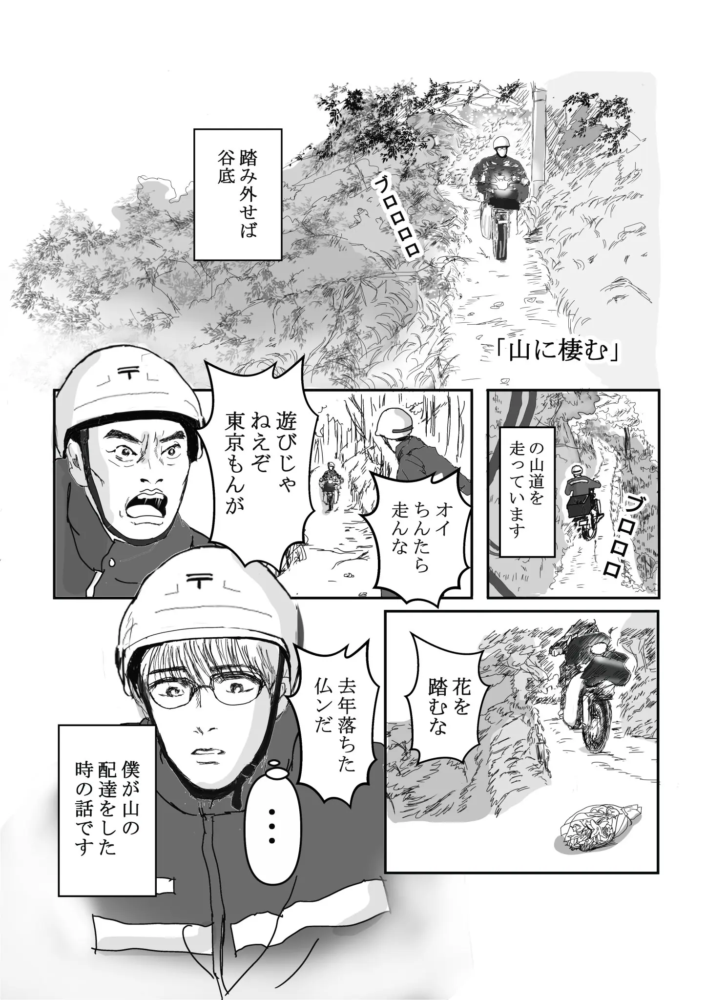 新人配達員と先輩配達員の不思議な交流を描いた漫画『山に棲む』が、Xにアップされた。本作は自身も郵便局員であるという送達ねこ(@jinjanosandou)氏が、配達員から聞いた体験談をもとに描いた1作。