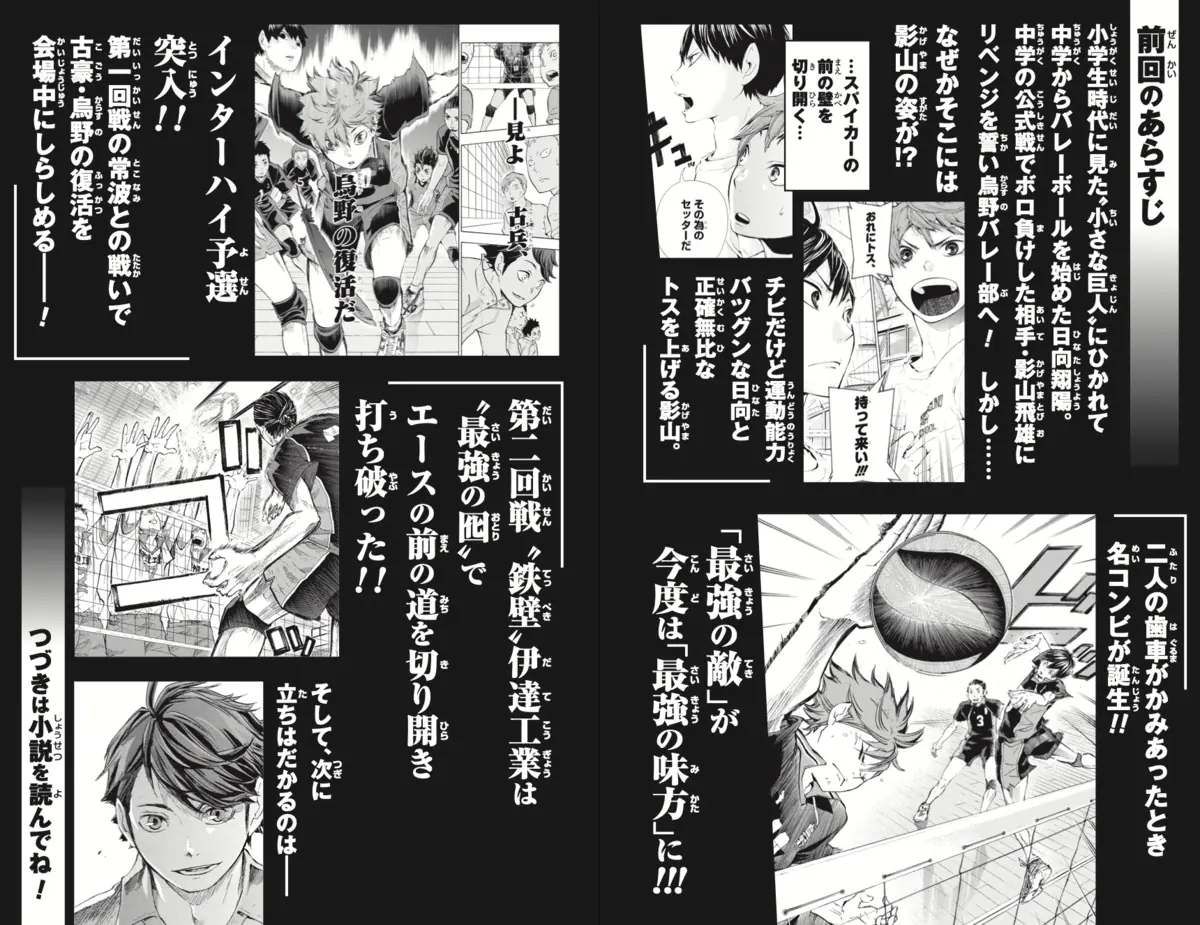 第3弾となる本書では、原作まんがの第6〜8巻の内容を主に収録し、インターハイ予選3回戦で対戦する烏野高校と青葉城西高校の試合が描かれる。烏野のセッター・影山飛雄と、青葉城西の主将で“大王様”と呼ばれる及川徹のセッター対決を軸に、チームとしての成長と勝負の行方はいかにーー。