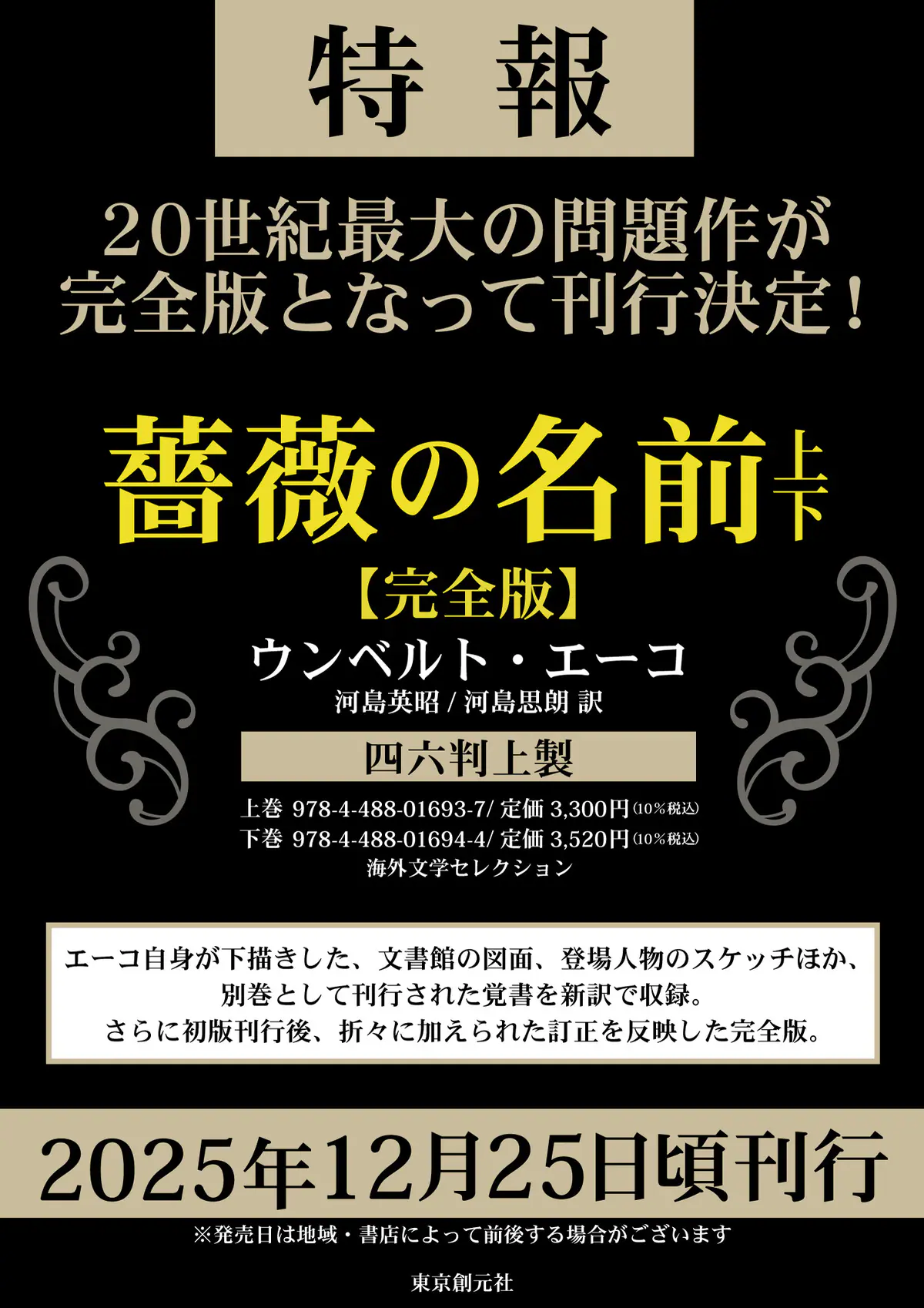 ウンベルト・エーコ『薔薇の名前[完全版]』(東京創元社)が2025年12月25日頃に刊行される。