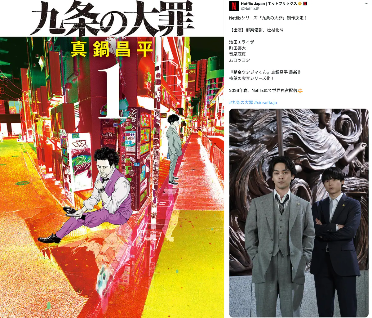 漫画『九条の大罪』の実写化が決定し、2026年春にNetflixで世界独占配信されることが発表された。
