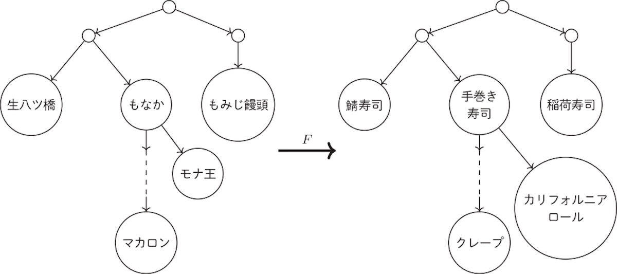 圏論において重要なのはモノそのものではなく、モノ同士の関係性や構造である。「もなかの家系図」の次に、同じような形の「手巻き寿司の家系図」を並べ、「マカロンとクレープは似ている」では共感してもらうのは難しいけれど、「“マカロンともなかの関係”と“クレープと手巻き寿司の関係”は似ている」なら共感してもらえるかもしれない。このように、圏論は数学的な概念だけでなく、メタファー(隠喩)や「人間が似ていると思うもの」まで扱うことができる。