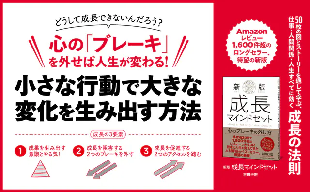 『新版 成長マインドセット 心のブレーキの外し方』元ガリバーインターナショナル専務取締役として18年間にわたり人材育成に携わった著者が、独自の成長理論を体系化した実践的な成長指南書。多くの人が無意識に踏んでいる「心のブレーキ」の存在を明らかにし、それを外すための具体的な方法を、図解とワークシートを使って分かりやすく解説している。