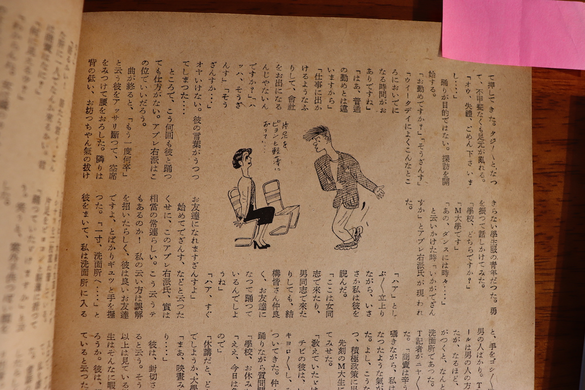 高畑:たくさんあります。例えば、ジャケットにTシャツを合わせるスタイルがいつからあったのか調べていたら、最初の例ではないと思うんですが、1951年の『スタイル』という雑誌に行き着きました。そこで銀座の昼間のダンスホールに女性のレポーターが潜入して、どんなやつにナンパされるかっていう記事が載っているんですが、テイラードジャケットに白Tシャツを合わせたナンパ青年が「アンダーシャツ氏」と呼ばれているんです。