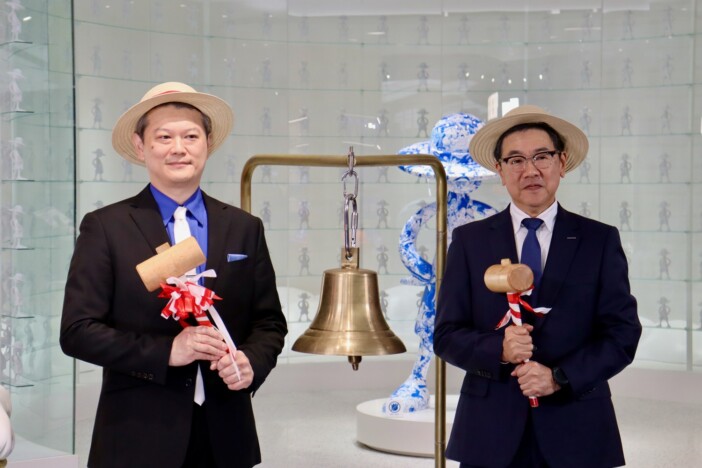 ルフィの麦わら帽を被った2人が鐘を鳴らす“出航の儀”に始まり、「訪れる皆様には、『進路は自由、航路は無限』という店舗のコンセプトを感じていただければ幸いと思っております」(川﨑)、「グランドラインのような空間にまるで島のように点在するグッズのスペース。『この世のグッズのすべてをそこに置いてきた。』、まるで“ひとつなぎの大秘宝”のような、あるいは世界中の海の食材が揃う奇跡の海“オールブルー”のような、そんな空間を冒険する麦わらの一味のような気持ちで、買い物を楽しんでいただければと思っています。」(中野)と双方とも『ONE PIECE』に絡めたコメントを披露。